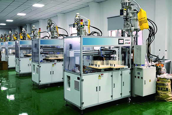 立式鎖模,立式射出轉(zhuǎn)盤2站式或者3站式,可雙色或雙材料一體成型。
